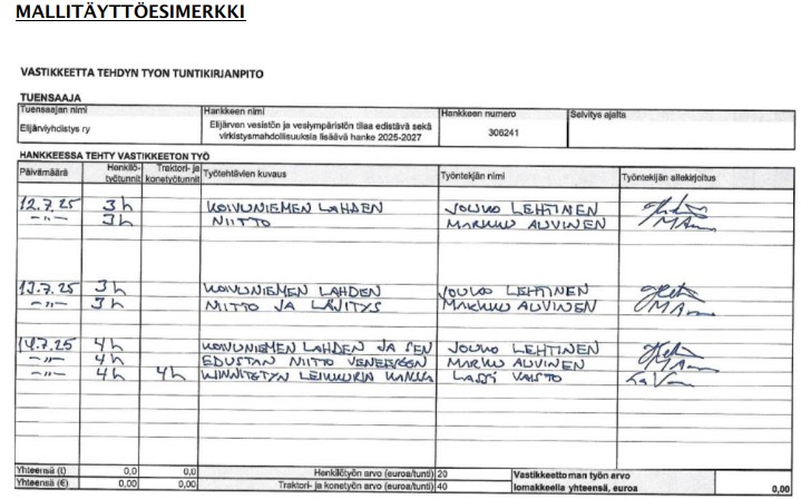 Tuen myöntämisen edellytyksenä on, että Elijärviyhdistyksen jäseniensä voimalla on tehtävä merkittävässä määrin talkootyötä avustuksen eteen. Talkootyö voi olla esim. oman rannan läheisyydestä vesikasvillisuuden poistoa viikatteella tai repimällä käsin. Jos talkootyö tehdään ainakin osittain konevoimalla, esim. niittotyö tehdään koneellisella leikkurilla tai niittojätteet korjataan rannasta traktorilla kauemmas rannasta vaikkapa hyötykäyttöön niin tällöin saadaan talkootyötä enemmän
